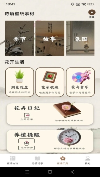 4、花语工具箱大全,内含测量花盆、花朵收藏、音乐播放等超多实用小工具。