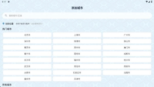 安装完成后进入应用,首次使用时需先确定所在城市位置,才能获取对应的天气数据。