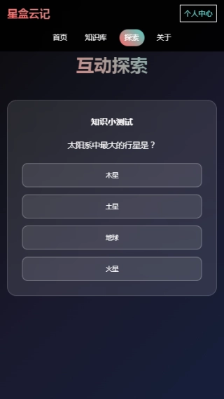 4、互动版块主要侧重于用户答题环节,借助此前对星系知识的了解,通过答题帮助用户形成更清晰的认知,同时检验自己对相关内容的熟记程度!