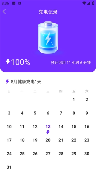 2、首页能看到当前电量显示和预计可用时长,下方还设有充电记录、电池预警等功能。