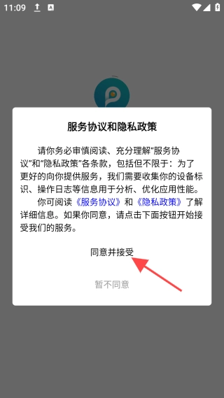 1、安装后,同意并接受“服务协议和隐私政策”。
