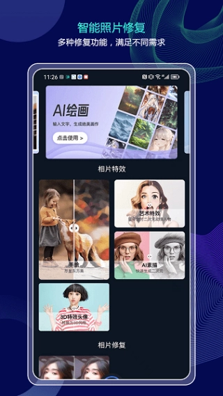 3、打开首页后,可依据自身需求,挑选相片特效或者相片修复的功能模块。