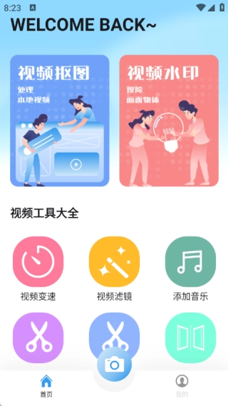1、在首页能够完成视频抠图、去除视频水印、调整视频播放速度、裁剪视频画面、为视频添加滤镜、将视频倒序播放、制作视频镜像效果、给视频贴入贴纸以及添加背景音乐等操作。