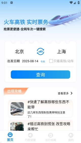 进入平台首页后,能便捷查询火车及高铁的实时票务信息,平台还会提供出行攻略类内容。