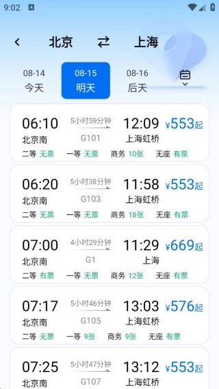 1、输入出发地、目的地与出行日期后,只需一键操作,即可查询全国范围内的高铁及火车车次信息,涵盖发车与到达时间、行程时长、各类票价以及余票剩余情况。