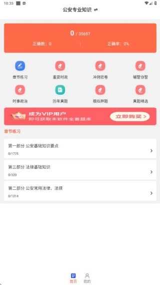 安装完成后,我们在首页就能看到章节练习、重要时政、冲刺密卷等多个板块,题目资源十分丰富。
