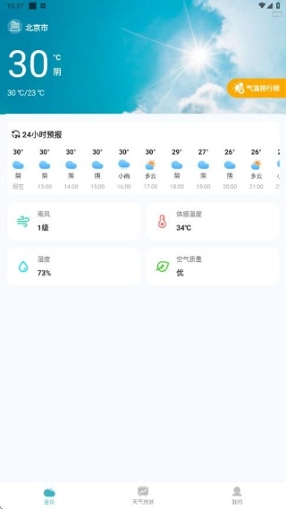 确定城市位置后,即可秒速呈现24小时天气数据,同时展示风力、体感温度、空气质量等相关参数。