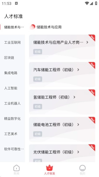 2、人才标准页面可查看各类人才需求,涵盖储能技术与应用、工业互联网等分类。