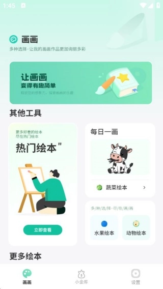 1、安装软件后点击打开,进入到平台画画界面,有热门绘本,每日一画提供,我的作品库是可以查看自己的绘画作品。