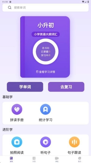 2、课堂页面为我们带来了学单词功能,从基础到进阶内容应有尽有,分类展示。