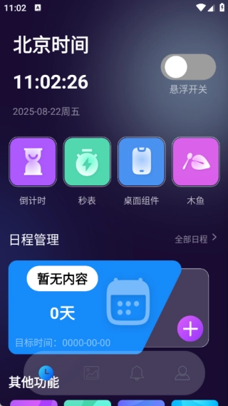 首页集成了倒计时、秒表、桌面组件、木鱼等实用工具,此外还包含日程管理及其他辅助功能。