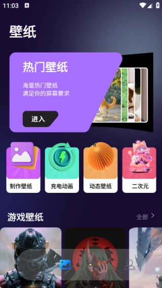 3、壁纸板块不仅收录了大量热门壁纸,还整合了壁纸制作、充电动画、动态壁纸以及二次元相关等丰富功能;