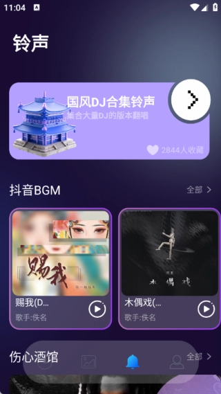 4、铃声包含国风DJ合集、抖音BGM、伤心酒馆等不同版块的内容。