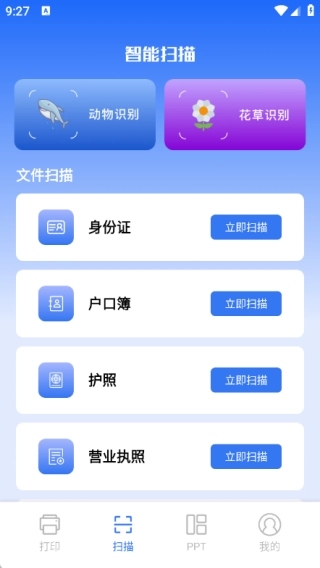 2、扫描页面具备动物识别、花草识别功能,同时还支持各类文件扫描等多种功能。