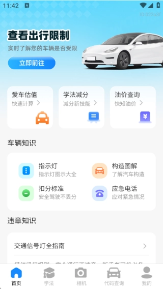 首页设有爱车估值、学法减分、油价查询、车辆知识与违章知识等服务板块。