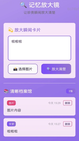 3、支持一键放大并留存图片细节,自动生成放大瞬间卡片,可对图片与文字记录进行分类存储,同时提供查看和删除功能。