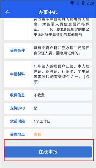 5. 最后选择在线申报,按照系统指引填写好相关信息,这样就完成整个挂失流程啦。