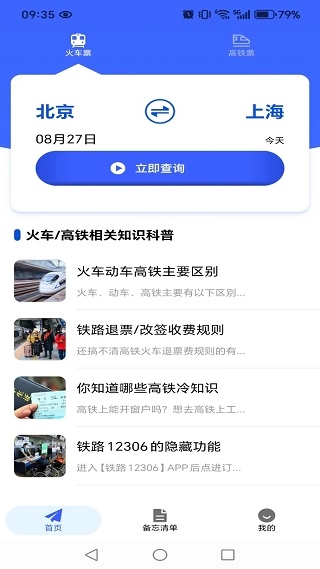 1、火车票查询功能在首页设有入口,点击“立即查询”即可使用,同时首页还呈现了与火车相关的科普内容。