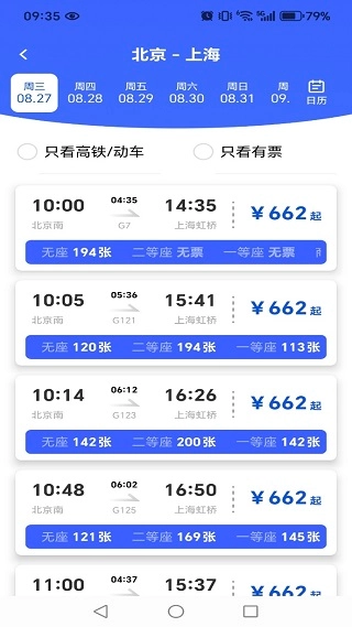 2、会同步展示当天的所有车次信息,对应的票价也会呈现,还能查询到不同座位的余票情况。