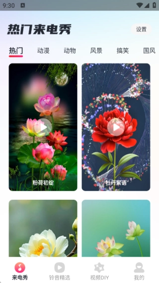 1、在来电秀页面,你可以浏览到热门、动漫、动物、风景以及搞笑等不同类别的来电秀内容。