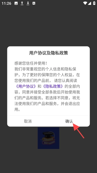 1、安装后,阅读确认“用户协议及隐私政策”。