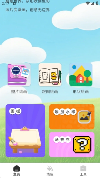 首页设有照片绘画、跟图绘画、形状绘画等功能版块,同时也展示了画板、添加水印、马赛克等不同类别选项。