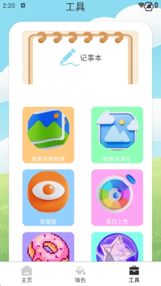 3、工具区里有图像风格转换、黑白上色之类的功能,还配备了记事本,能方便大家记录重要的事情。