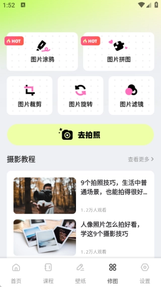 4、修图功能涵盖图片涂鸦、拼图、裁剪、旋转及滤镜等版块,此外还支持拍照功能,并能查看摄影教程。