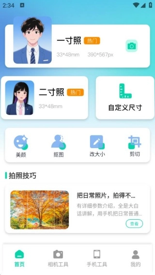 1、提供标准尺寸与自定义尺寸两种选择,结合抠图、背景更换功能,能够制作出满足需求的精致证件照。