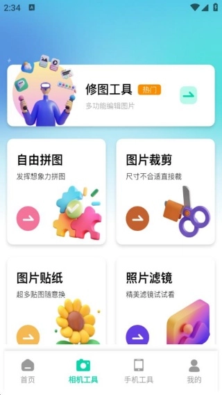 2、相机工具类型丰富多样,涵盖修图工具、自由拼图、图片裁剪等多种实用工具,可供用户便捷选择。