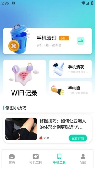 2、除了图片编辑功能外,还能直接清理手机垃圾、记录WiFi信息、开启手电筒,做到一个软件满足多种需求,操作便捷。
