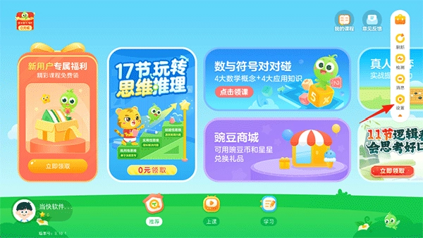 1、首先打开豌豆素质学生端,在首页右上角找到并点击工具箱,随后点击设置选项。