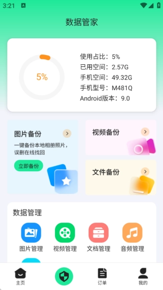 2、在数据管家页面可以进行图片备份、视频备份和文件备份,同时支持各类数据管理;