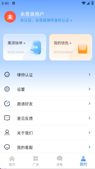4、在我的页面中可以进行案源接单、还可以进行律师认证、设置以及邀请好友等操作。