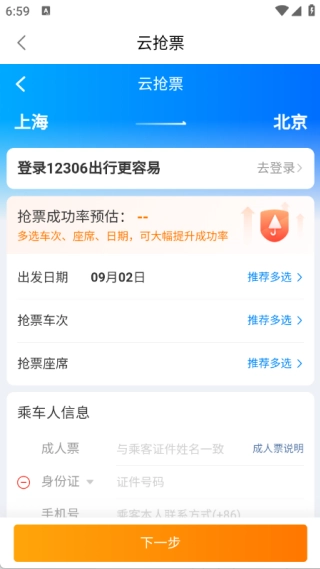 4、选择好信息后点击抢票,然后输入乘车人的信息,还有抢票的车次和座席,再点击下一步即可快速处理。