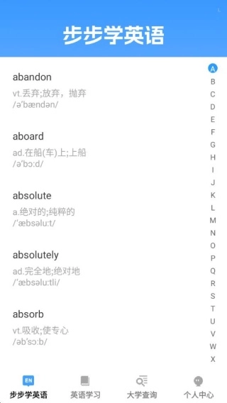 步步智知软件是一款非常不错的英语学习手机软件,整合了英语学习多维度资源与全国院校信息查询服务,不仅收录海量英语单词并按首字母顺序排序,方便用户系统背记,还提供英语题库资源,同时支持用户查询全国各地大学详情,助力全面规划学习与升学方向。
