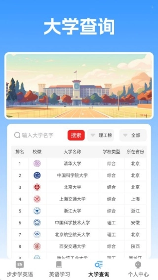 1、将英语学习与大学查询功能结合,提供从学习提升到升学参考的一站式服务,满足双重需求。