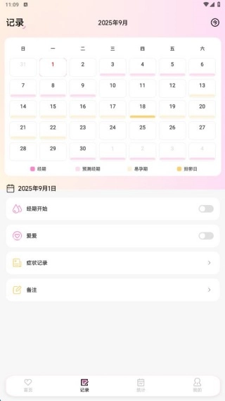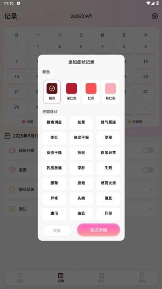 2、记录页面让我们在日历页面,直观浏览哪几天是特殊日子,还有症状记录功能哦。