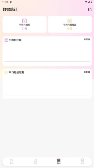4、在统计页面,则涵盖了具体的时间分析情况,让你了解个人月经天数和周期。