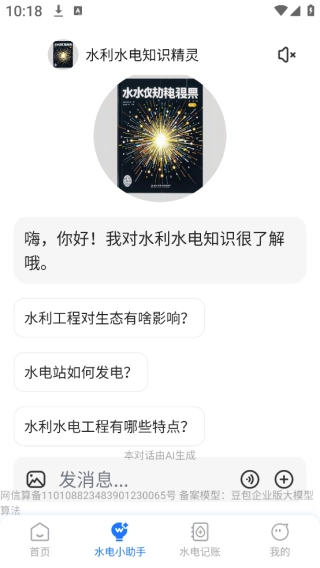 2、水利水电知识精灵,可解答水利工程对生态的影响、水电站发电原理等水利水电领域的相关问题,既有实用性,又具科普价值。