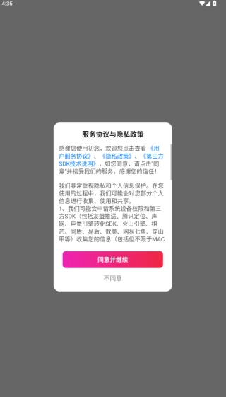 软件安装完成后打开,会弹出是否同意的提示,点击同意即可进入注册界面。