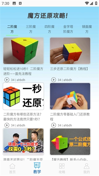 3、点击下方教学,可以看到各个不同类型魔方的视频教程;