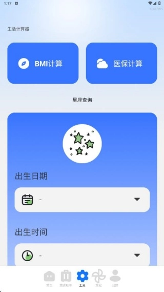 3、在工具页面,输入你的出生信息查询星座,还能进行bmi和医保计算。