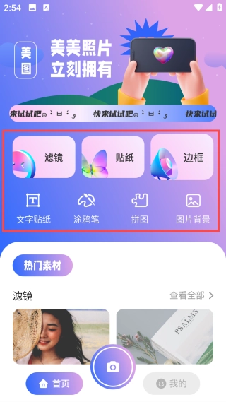 1、打开首页,开启对应的权限,查看功能模块,点击【滤镜】图标。