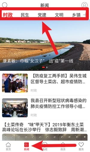 3、点击底部导航栏新闻栏目,即可查看时政、民生、党建等分类新闻内容并进行切换。