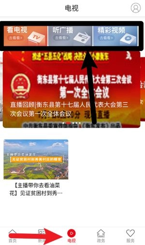 4、点击底部电视栏目后,可在顶部选择看电视、听广播、精彩视频等多种媒体播放选项。