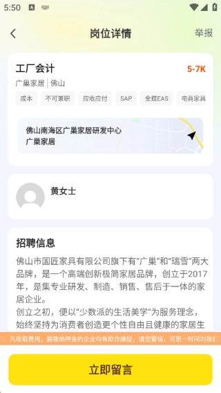 3、每个岗位均配备详尽的招聘信息,若用户符合相关要求,可直接进行留言操作。