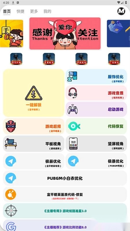 1、画质优化:一键解锁120帧超高清画质,让游戏画面更细腻逼真;支持优化游戏服饰,使角色服装更精致,细节更丰富;还能对PUBGM小白衣进行优化,去除皮肤资源以提高流畅度。
