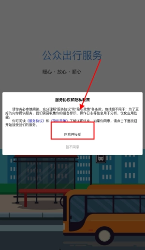 1、打开蚌埠公交,点击“同意并接受”。
