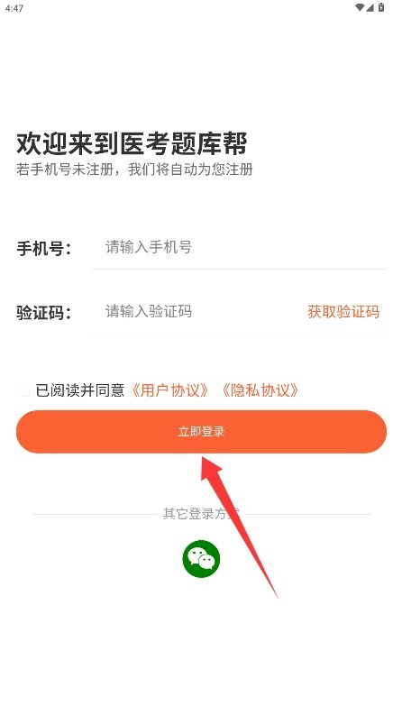 1、在登录页面填写手机号码和验证码,勾选同意相关条款后点击立即登录按钮完成验证。